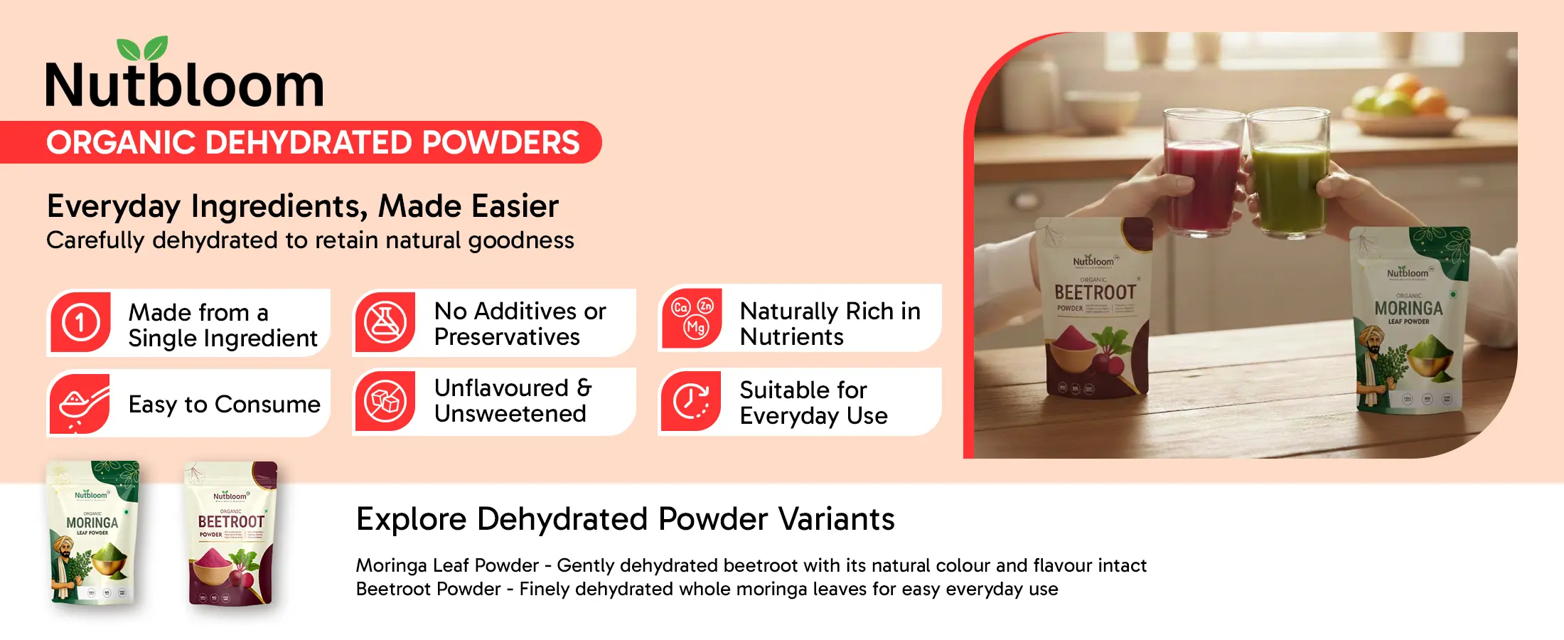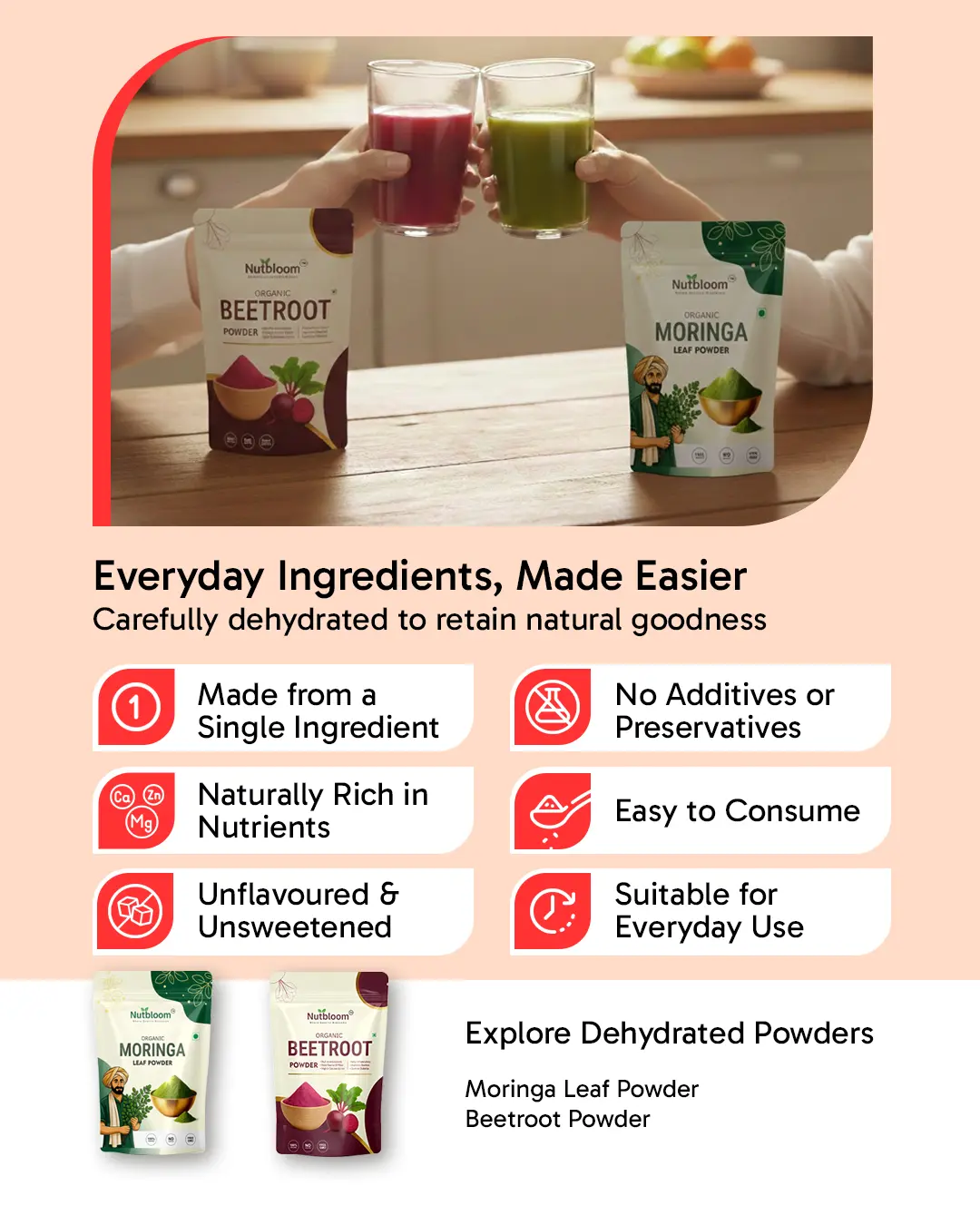 Discover Nutbloom’s 100% natural Beetroot and Moringa powders. Packed with nutrients, freshness, and taste—perfect for a healthy lifestyle, smoothies, cooking, or daily wellness boost.