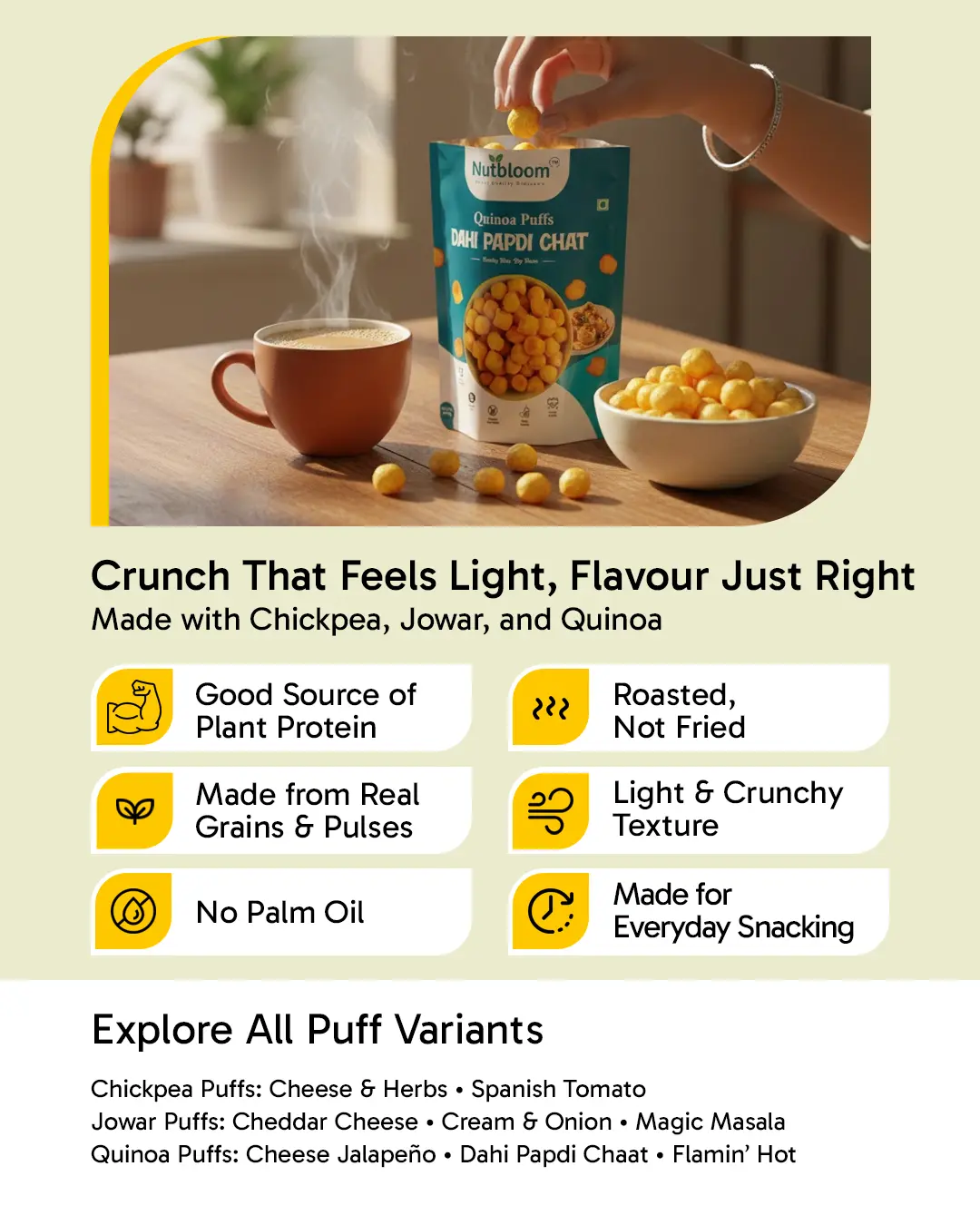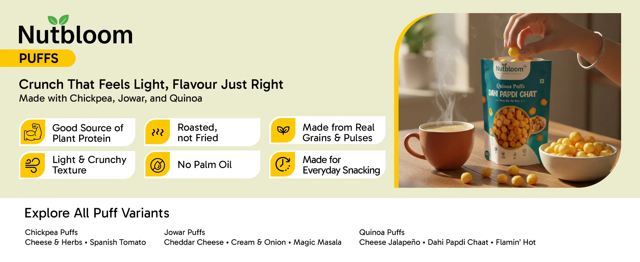 Explore our collection of crispy, light, and guilt-free puffs. Made from nutrient-rich ingredients like quinoa, jowar, and chickpeas, they are the perfect smart snack for any time.