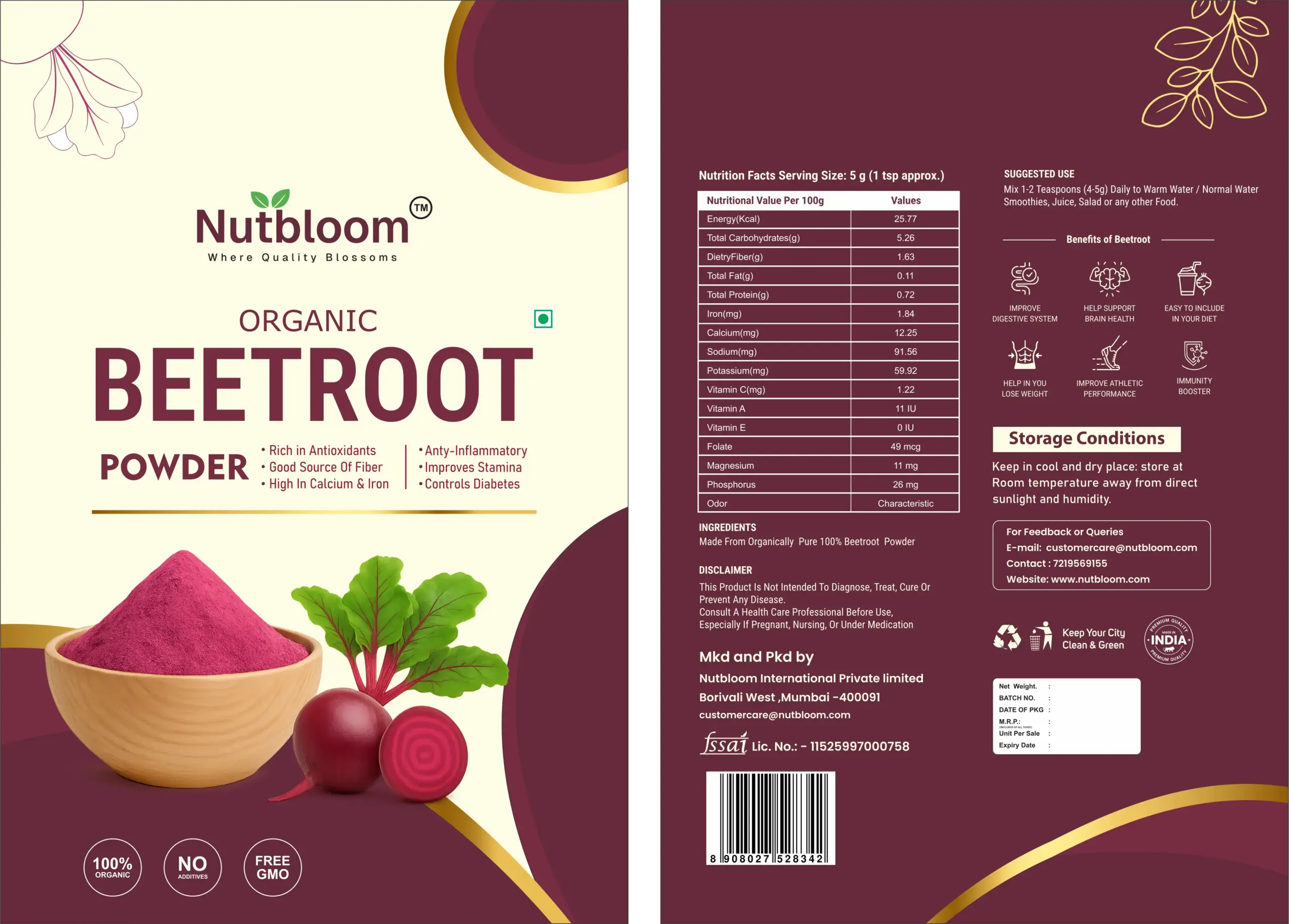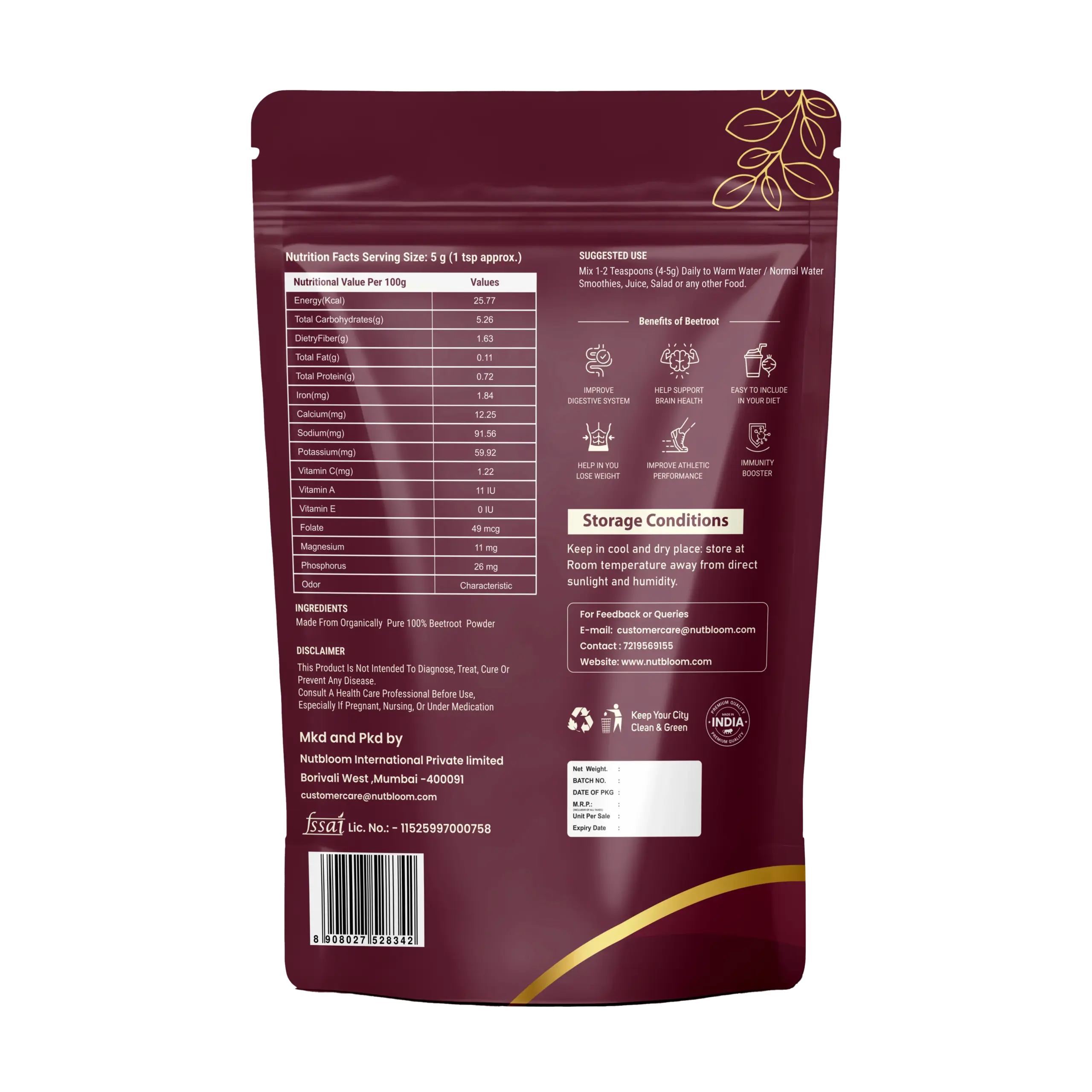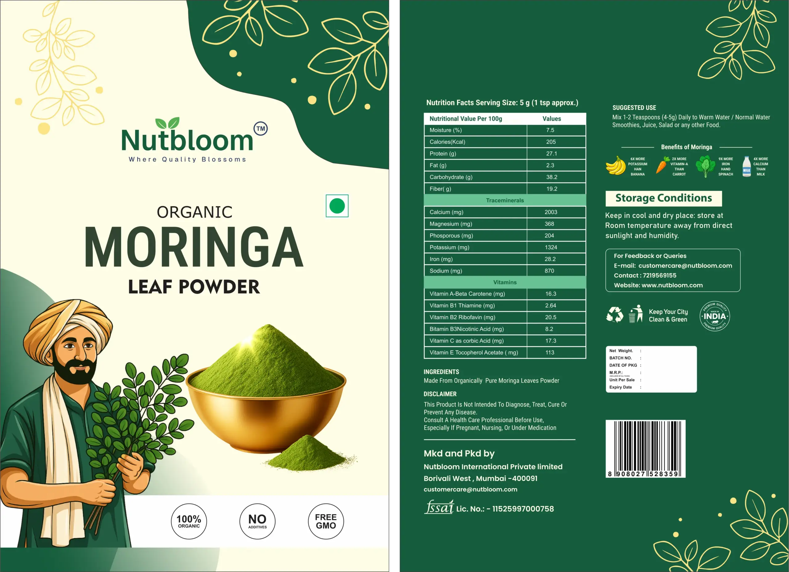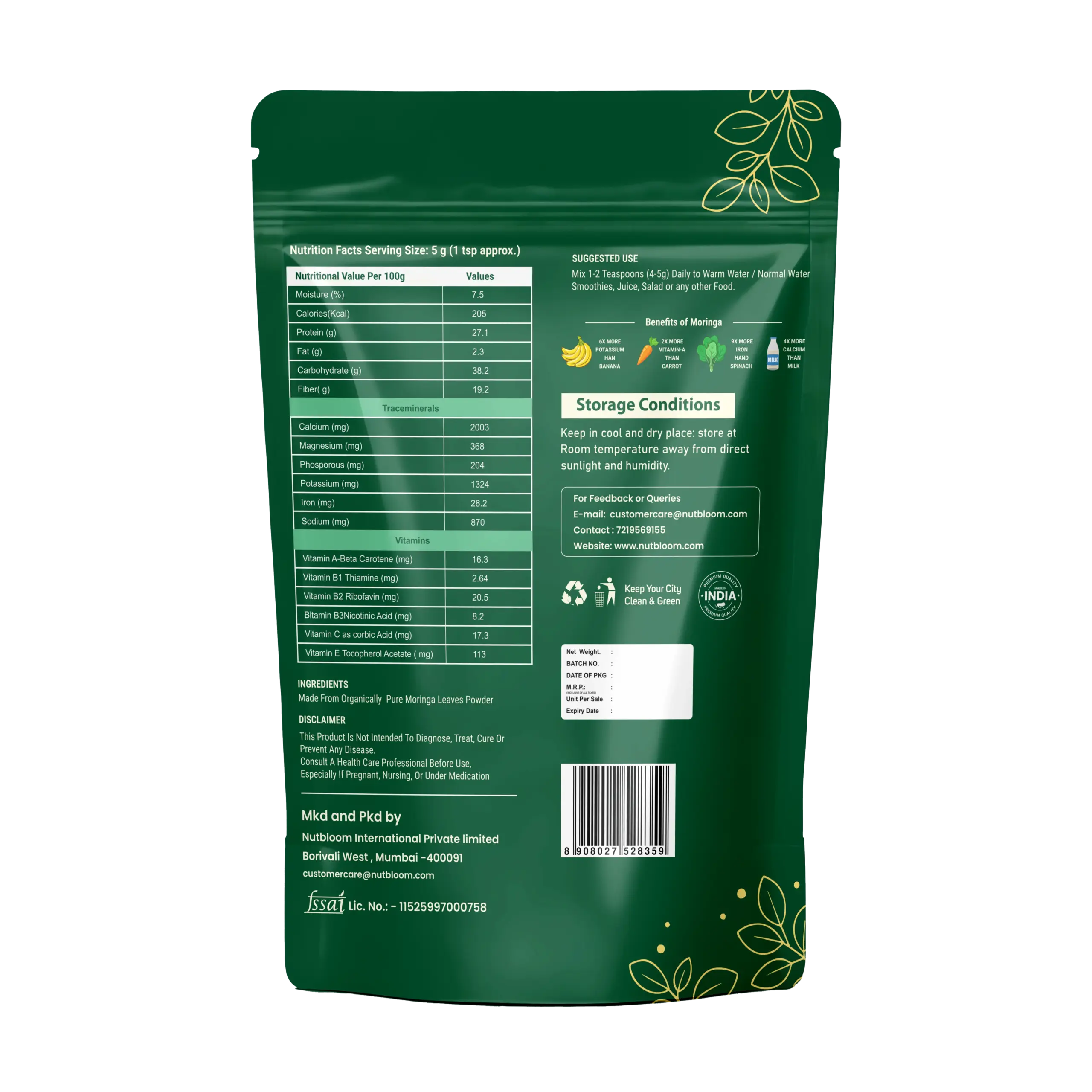 - Packed with vitamins and antioxidants, Nutbloom’s Moringa Powder is a powerful superfood made from 100% natural, dehydrated moringa leaves. Add a nutrient-dense boost to your diet with this easy-to-use, all-natural powder. Made from 100% natural, dehydrated moringa leaves Rich in vitamins A, C, calcium, iron, and protein High in antioxidants and anti-inflammatory compounds Gluten-free, non-GMO, and vegan-friendly