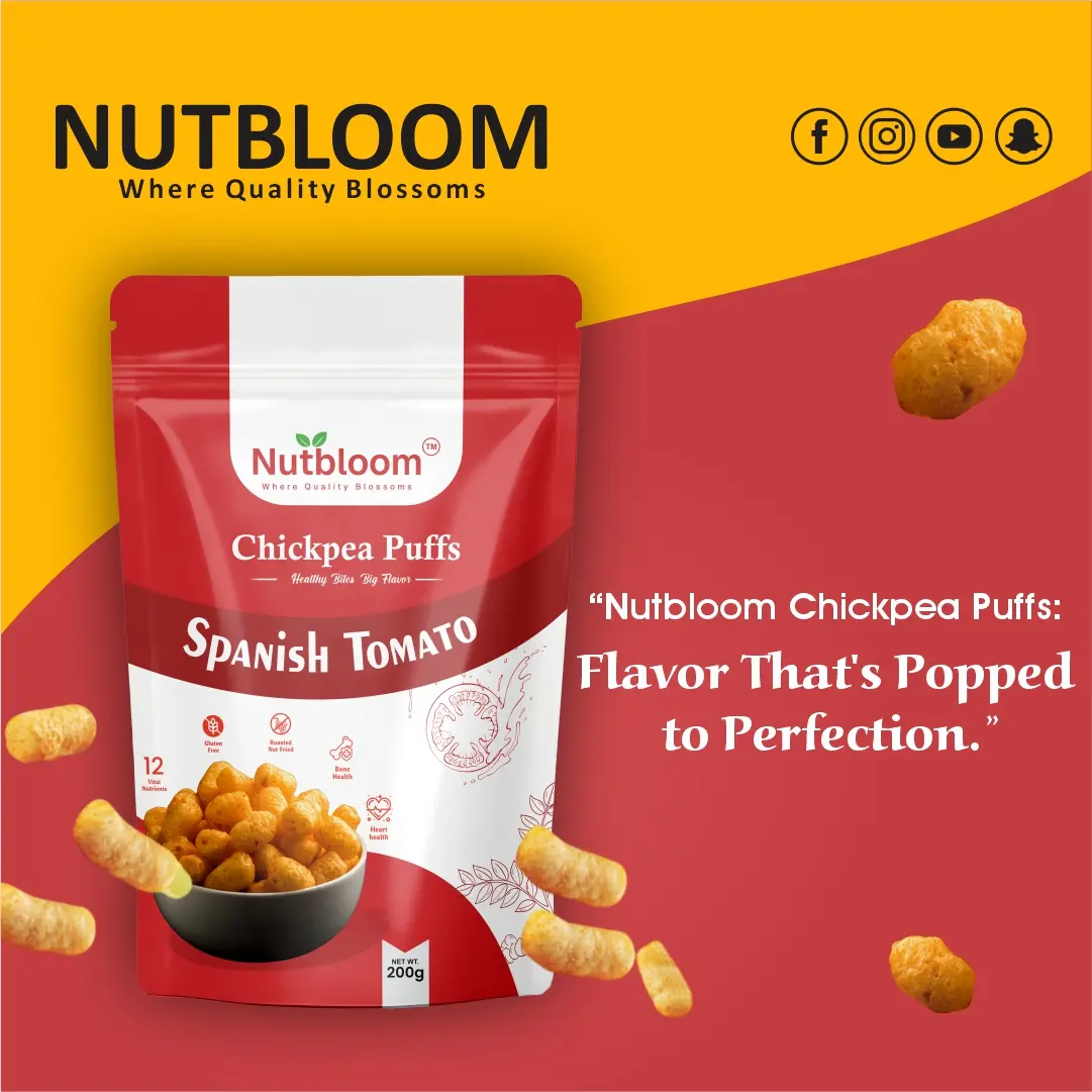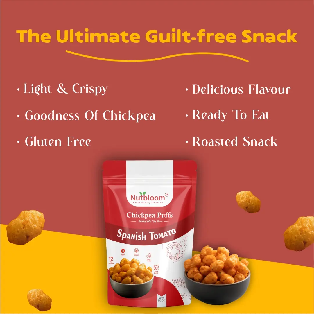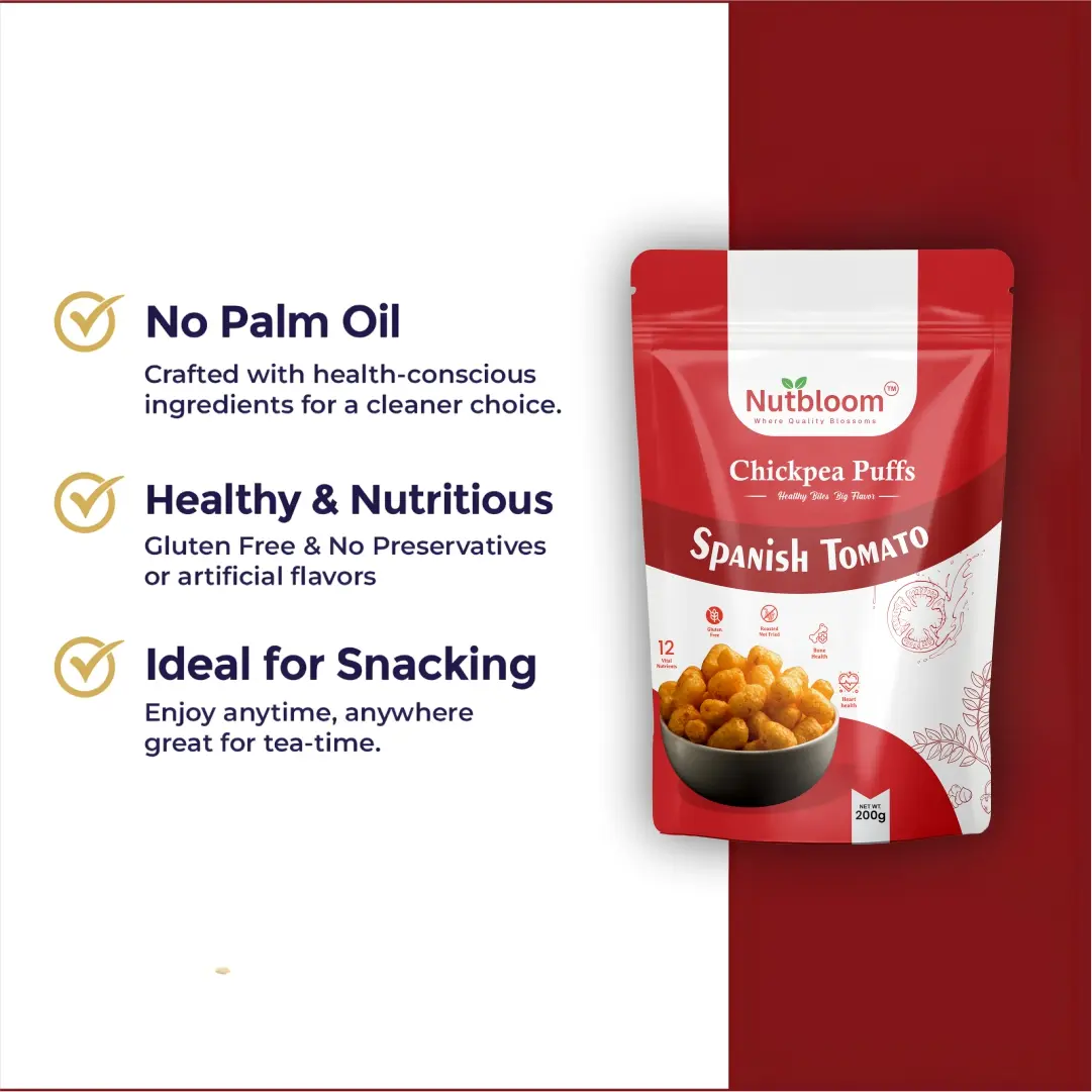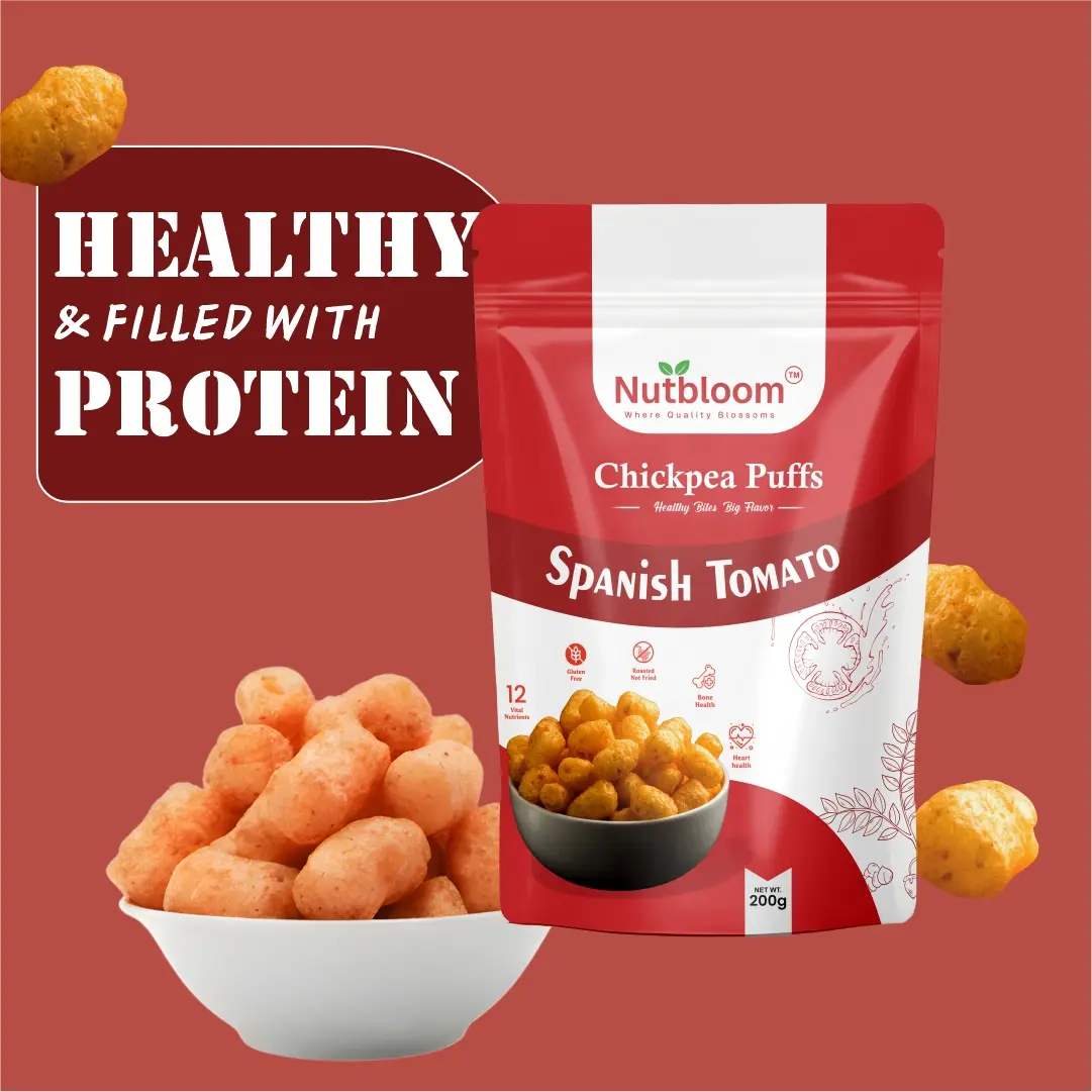 Nutbloom’s Spanish Tomato Chickpea Puffs are light, crunchy, and packed with a tangy tomato flavor. Made from protein-rich chickpeas, these roasted puffs are a guilt-free and wholesome snack for any time of the day.